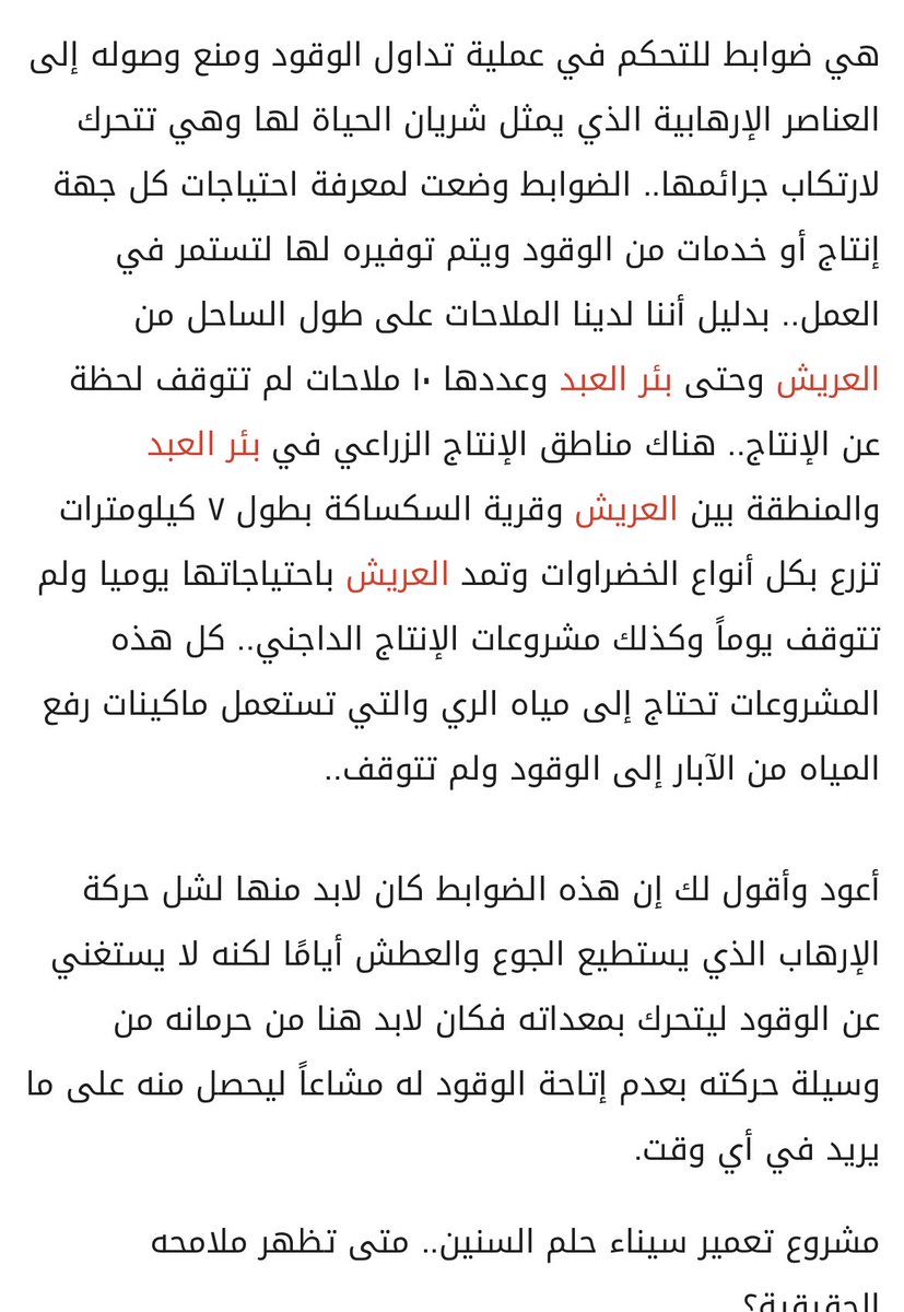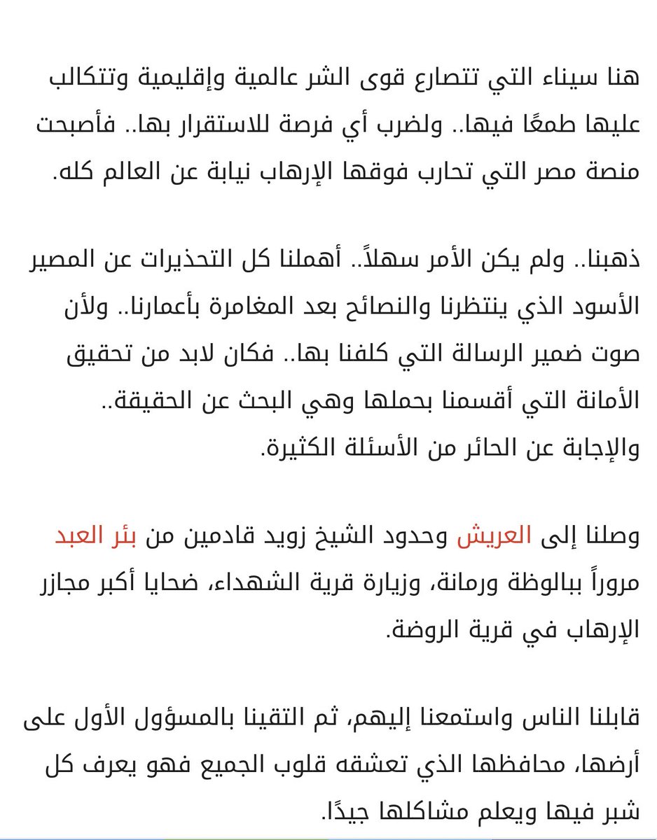 التعمير لسيناء مش رفاهية ولا بناء لمجد شخصي لأي قائد، دا ضرورة بيحتمها علينا الأمن القومي لمصر ولسة ذاكرتنا حاضرة بالويلات اللي شافوها أهل سيناء والقوات المسلحة وتضحياتها من أغلى أبناءها وشهداء الشعب المصري.