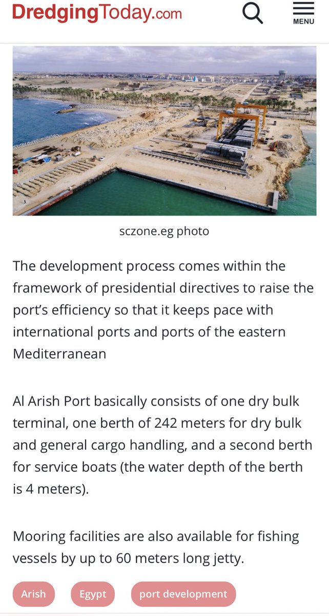 وصولا إلى #ميناء_العريش البحري اللي تمت فيه عملية تطوير كبيرة بكل منشآته وأرصفته ضمت بناء رصيف طوله 1.5 كيلو متر بدلا من الرصيف القديم اللي كان طوله 242 متر فقط، بالاضافة لتعميق الميناء من 7 متر لـ14 متر عشان يسمح بدخول سفن حمولتها توصل لـ40 ألف طن وزيادة عدد السفن
