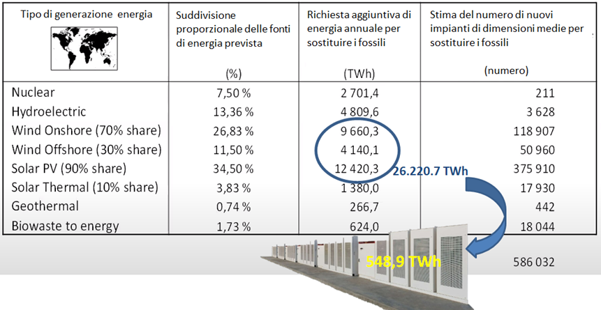 Quindi se vogliamo ottenere 1000 TWh all’anno, usando questi sistemi, si dovrebbero far funzionare 142 impianti a carbone, oppure 30.266 impianti fotovoltaici di media dimensione, oppure 12.309 impianti di pale eoliche sempre di dimensioni medie.