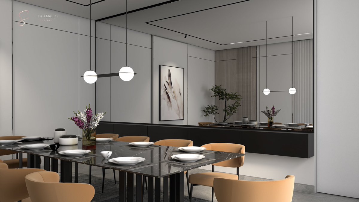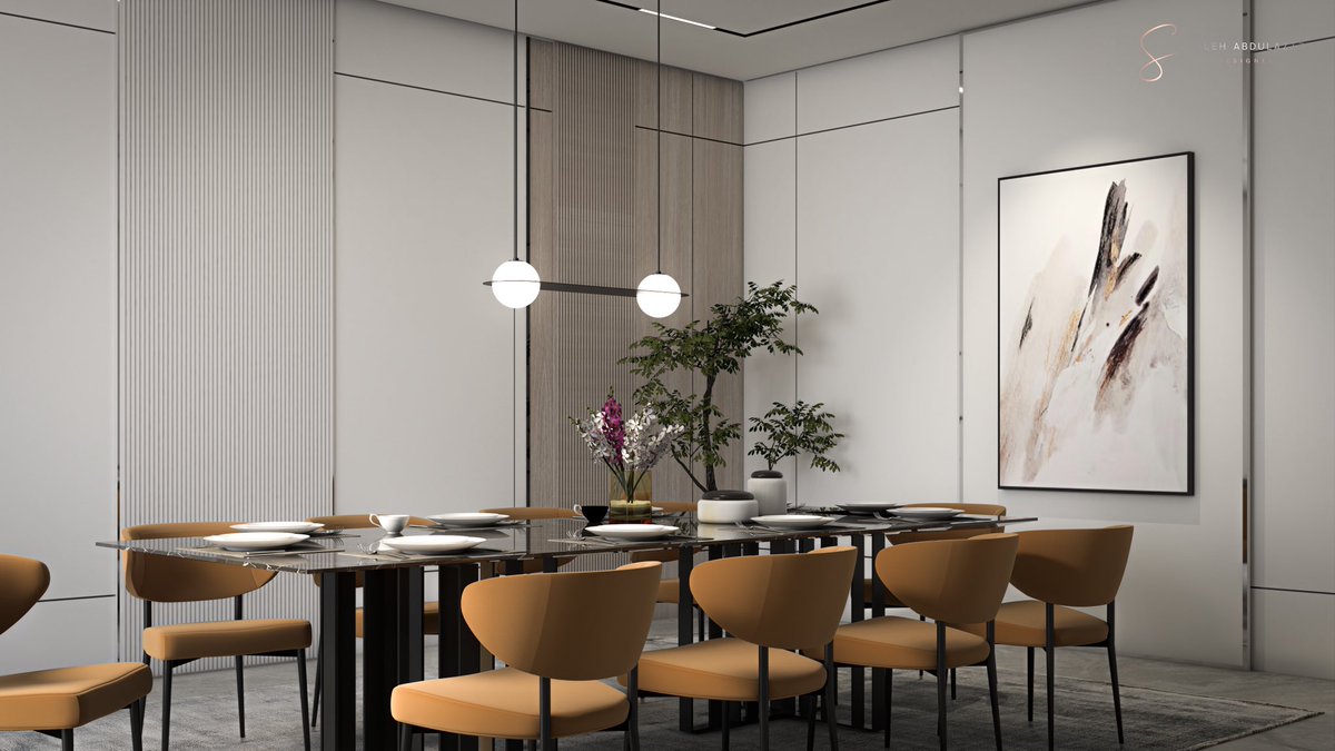 وهنا غرفة الطعام ايضا تم الاعتماد فيها على نفس تشكيلة المجلس واختيار اللون البرتقالي للكراسي لاضافة تميز في المكان