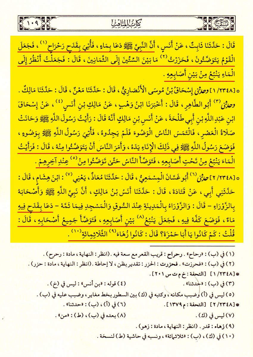 ١- روى البخاري في صحيحه عدة روايات لمواقف مختلفة ظهرت فيها معجزة النبي صلى الله عليه وآله في تكثير الماء، في كل مرة يضع يده في إناء صغير، فينبع فيه الماء فيتوضأ منه أناس كثيرون (٧٠، ٨٠، ٣٠٠، ١٥٠٠) وفي بعضها توضَّؤوا وشربوا جميعاً.