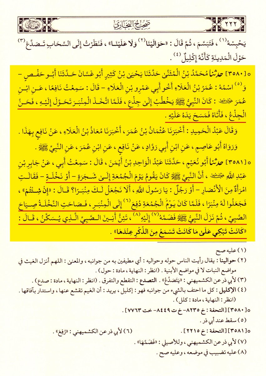 ٦- روى البخاري في صحيحه أن النبي صلى الله عليه وآله كان يخطب مستنداً إلى جذعٍ في المسجد، وأنه بعد ما صُنِعَ له المنبر وارتقى عليه سمعوا حنيناً من الجذع، وصوتاً كصوت الناقة، وفي رواية أنها كانت نخلة وأنهم سمعوا لها صياحاً كصياح الصبي.