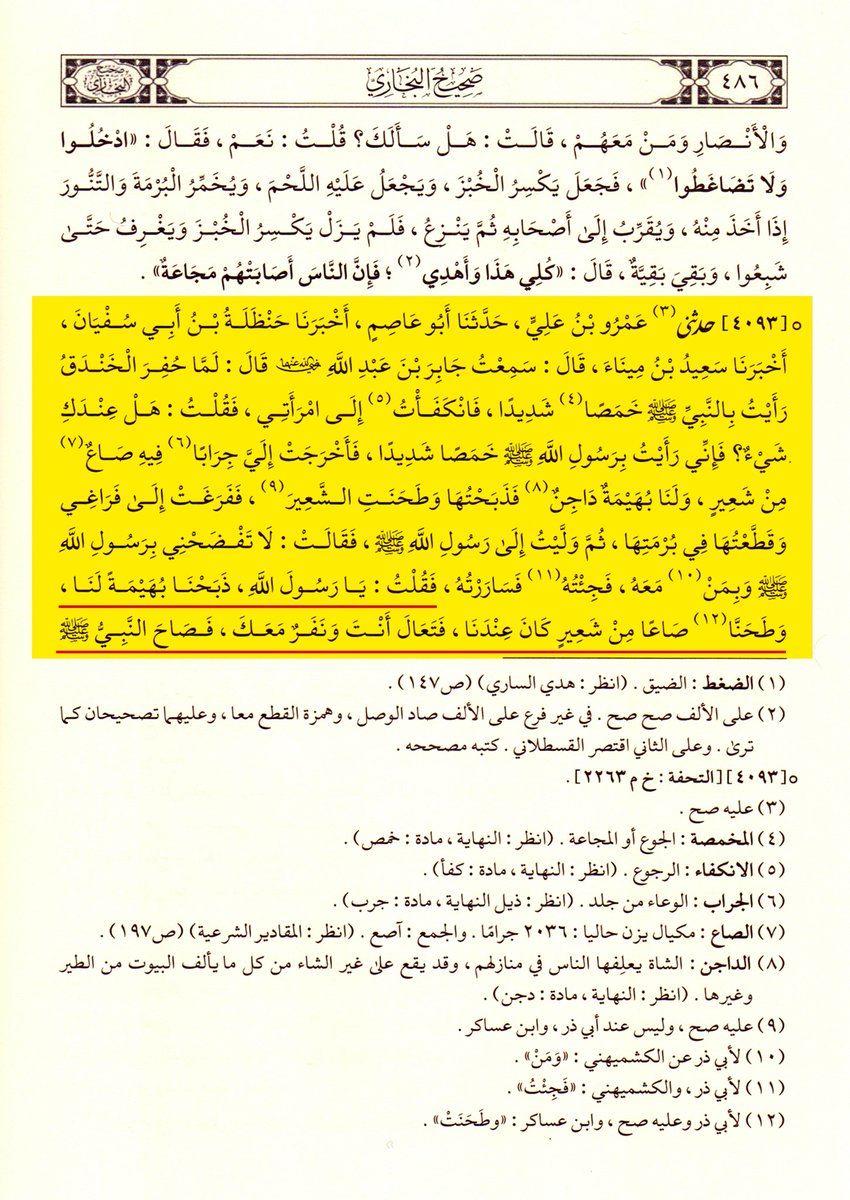 ٣- روى البخاري في صحيحه رواية تفيد ظهور معجزة تكثير الطعام ببركة النبي صلى الله عليه وآله، حيث دعاه جابر بن عبد الله الأنصاري وقد ذبح بهيمة وطحن صاعاً من شعير، وقد كثّر الله الطعام ببركة نبيه فأكل منه ألْفُ رجل.