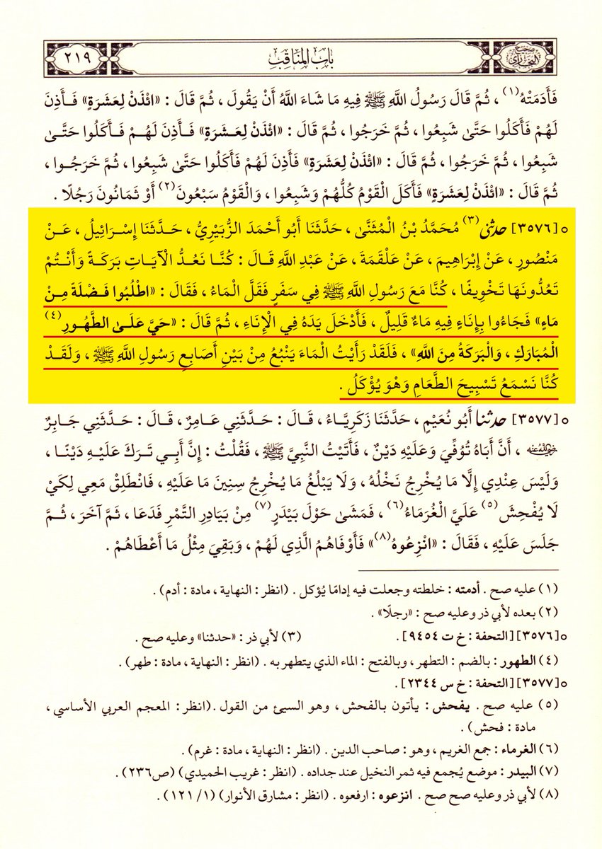 ٤- روى البخاري في صحيحه رواية عن بعض الصحابة وفيها أنهم كانوا مع النبي صلى الله عليه وآله في سفر، وأنهم جاؤوه بإناء فيه ماء قليل، فوضع يده فيه فنبع الماء من بين أصابعه، وأنهم كانوا يسمعون تسبيح الطعام وهو يُؤْكل.