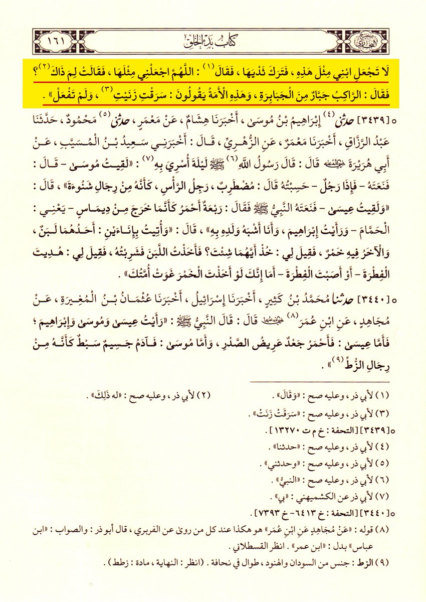 ١٠- روى البخاري في صحيحه رواية تفيد تكلُّم ثلاثة أشخاص وهم في المهد، أحدهم عيسى عليه السلام، والثاني شهد ببراءة رجل من الزنا، والثالث دعت له أمه وهو يرضع من ثديها بدعاءٍ جهلاً منها بواقع الحال، فنطق ودعا لنفسه بما فيه الصلاح.