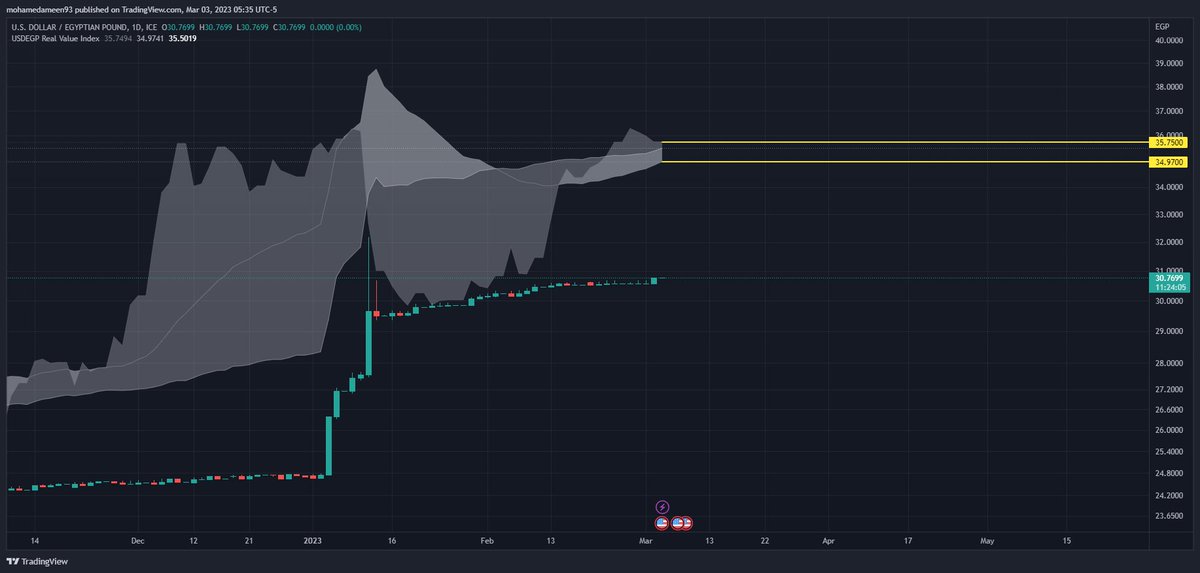 في نهاية يناير، كان مؤشر القيمة الحقيقية بيتراوح بين 30.5 جنيه لـ34.65 جنيه، وكان السعر الرسمي 31.13 جنيه لكل دولار، وده كان وضع جيد جدًا وإشارة إلى إن السعر الرسمي بيعكس بقدر كبير القيمة الحقيقية للعملة.