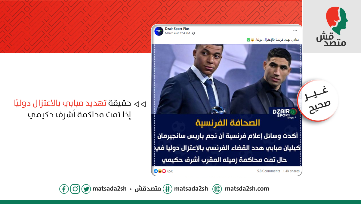 - الكلام ده غير صحيح. كيليان مبابي لم يهدد القضاء الفرنسي بالاعتزال الدولي، ولم يعلق حتى الآن على الاتهامات الموجهة لأشرف حكيمي. ✅✅ @KMbappe