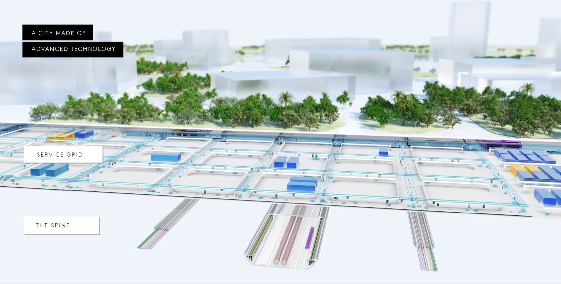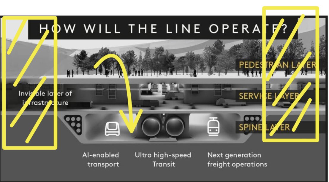 نمط توزيع #ذا_لاين تحت الأرض على مستويين منفصلين، مستوى خاص بقطار عالي السرعة،ومستوى للبنية تحتية. فوق الأرض ستكون هناك مساحات خضراء للسكان وممرات للمشاة بدلاً من السيارات.