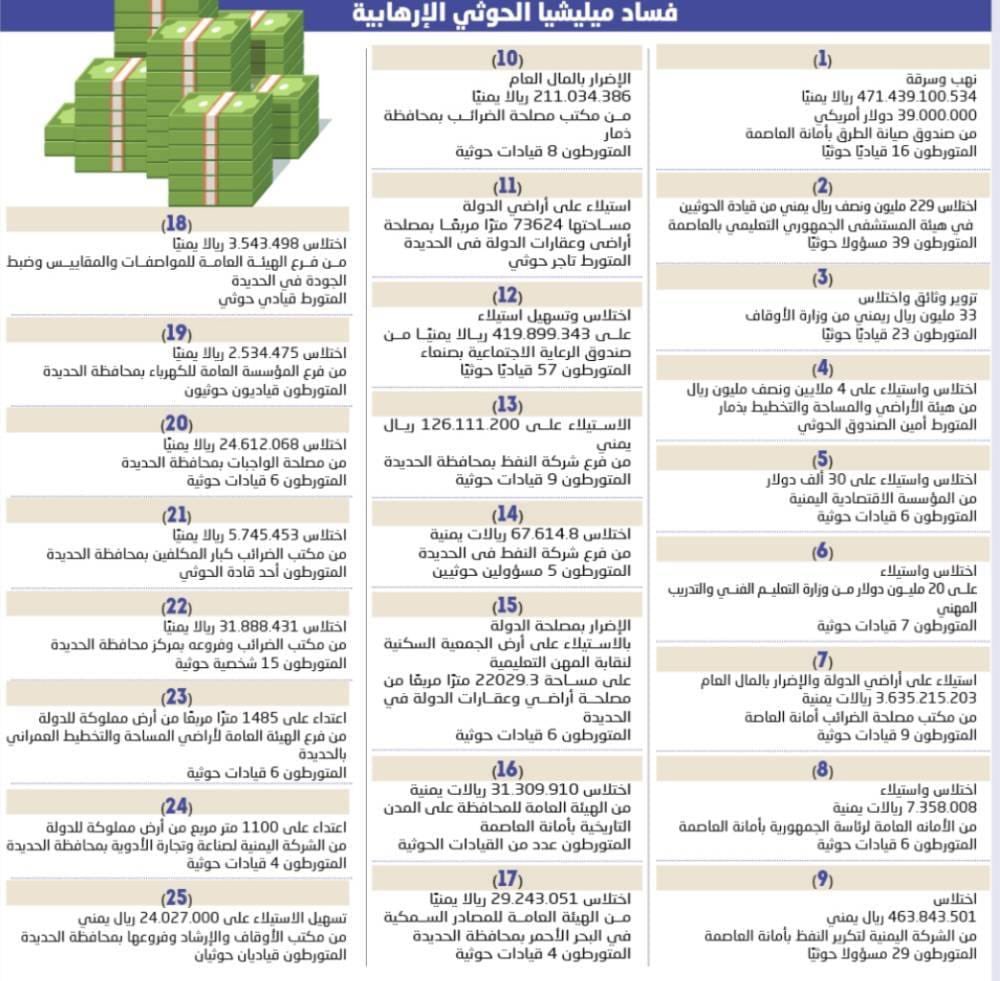 بالارقام والانفوجرافيك. كشف لصوصية المليشيا الحوثية ونهبها لمقدرات وثروات البلاد في ظل وضع انساني كارثي ترزح تحته المناطق الواقعة تحت سيطرتها..