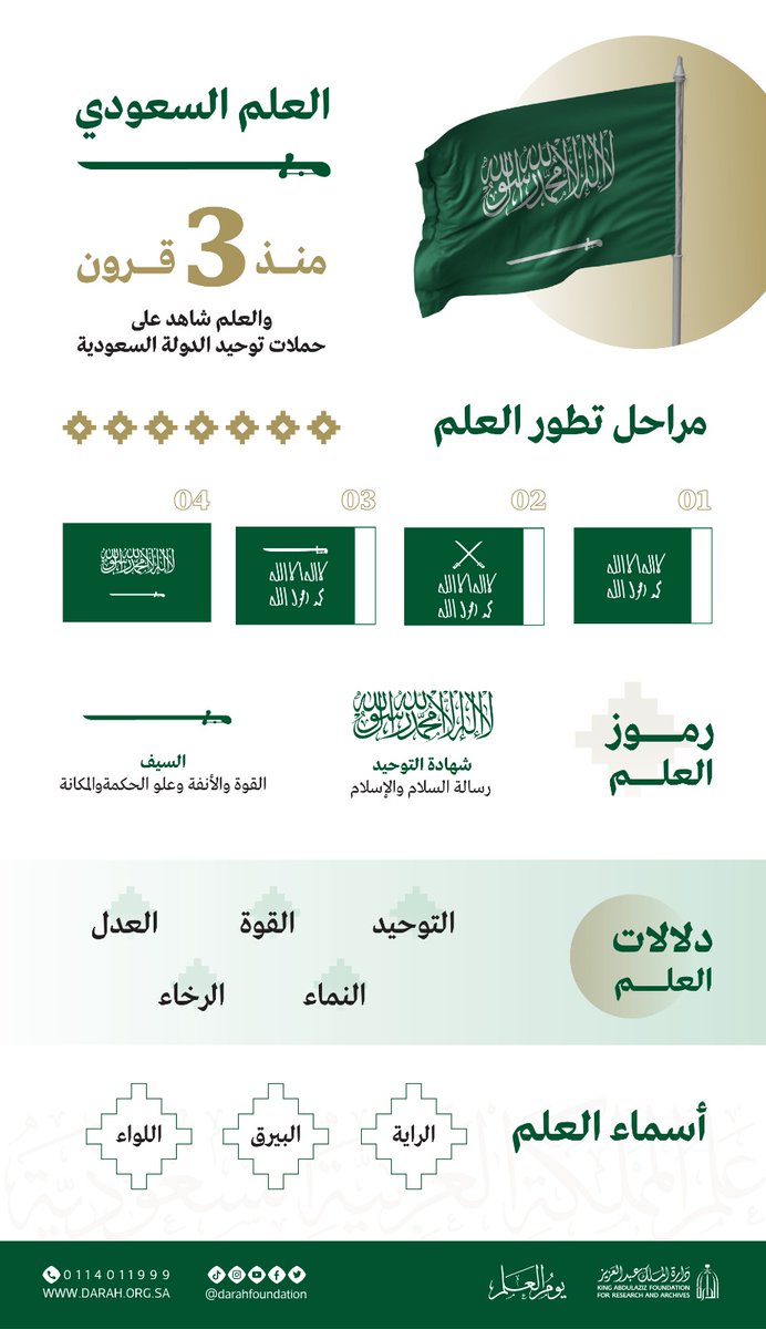 يحمل #العلم_السعودي 🇸🇦 تاريخًا، ورموزًا، ودلالات مهم التعرف عليها، نختزلها في هذه المعلومات السريعة.