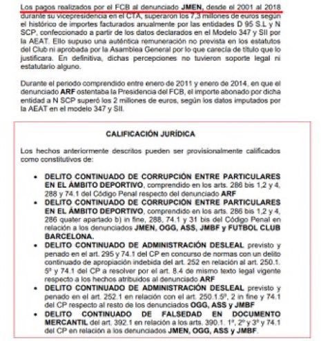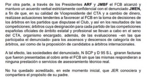 أنه من خلال الرئيسين روسيل وبارتوميو، توصل برشلونه إلى إتفاق شفهي سري للغاية وحافظ عليه مع المتهم نيغريرا ، وذلك بصفته نائب رئيس اجنة الحكام ومقابل المال لتنفيذ الإجراءات التي تميل إلى تفضيل برشلونة في اتخاذ قرارات الحكام في المباريات التي يلعبها النادي