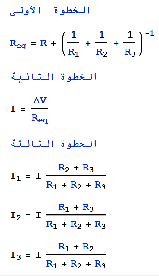 وفي حال كانت الدائرة تحتوي على ثلاث مقاومات على التوازي، فيمكن إيجاد التيارات الفرعية بنفس الطريقة السابقة كالتالي: