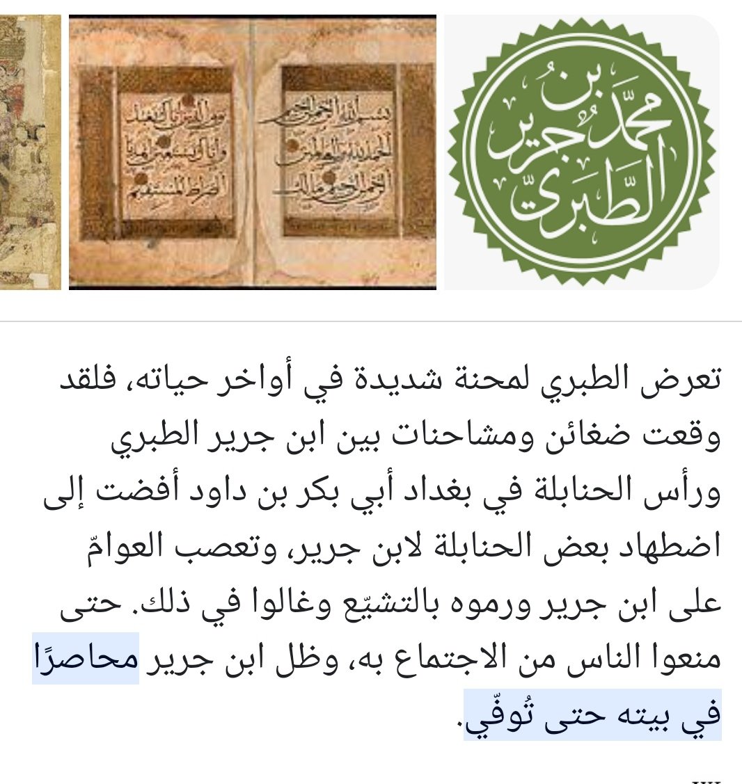 الطبرى قتل، والحلاج صلب، والمعرى الضرير حُبِس، وسفك دم ابن حيان، ونفى ابن المنمر، وحرقت كتب الغزالى وابن رشد والأصفهانى، والفارابى والرازى وابن سيناء والكندى اضطهدوا وكفّروا وهدر دمهم.🔻