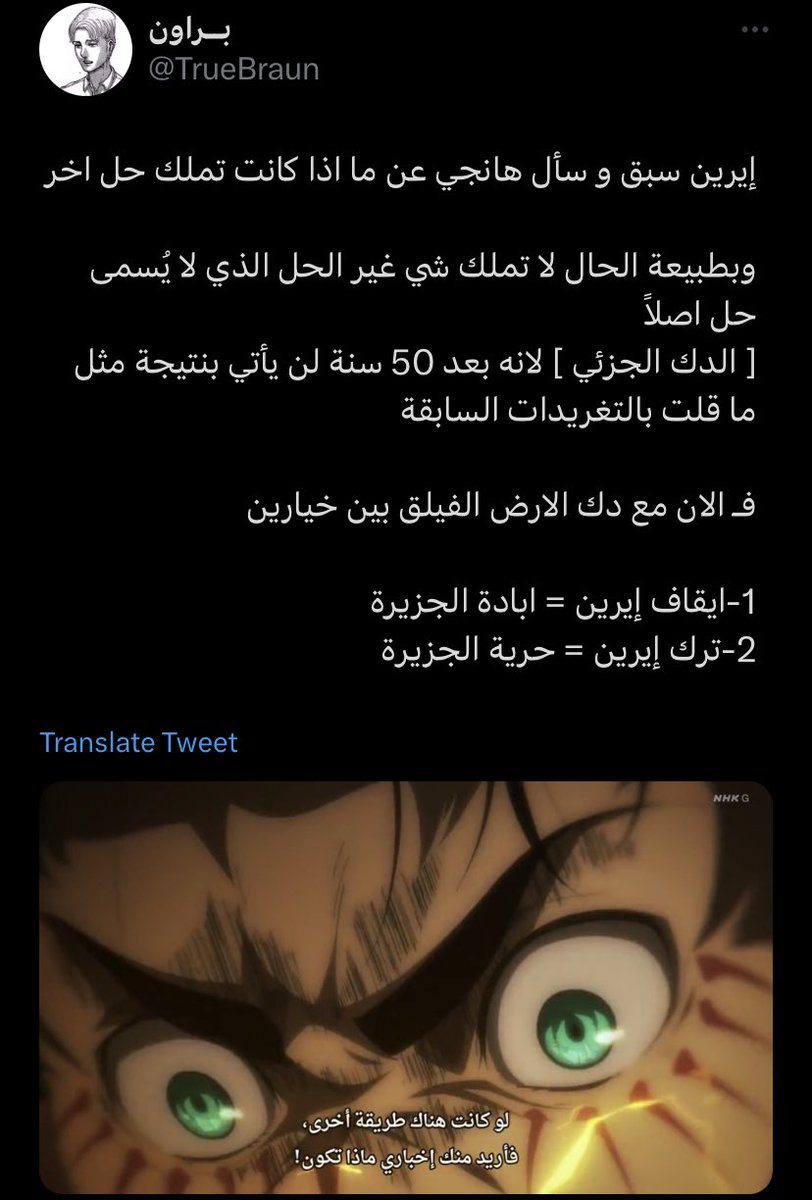 لاني كتبت الثريد اساسا يوم شفت بعض الردود على هذي بادعائهم ان ايرين كان مفروض يخبر هانجي بالمستقبل شيكو عالثريد لاني بحاول ما اعيد كلام كتبه سابقا براون.
