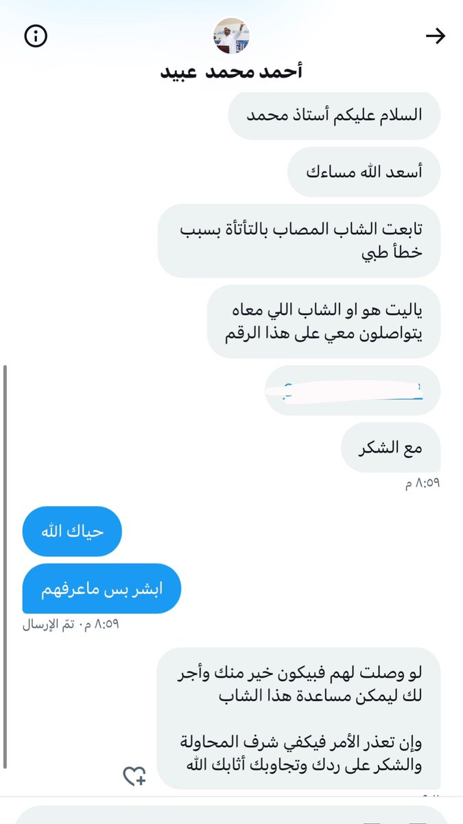 وحاليا نبي نساعده في علاجه الي قادر يساعدنا يتواصل معي خاص وشكرا لجميع 🌹