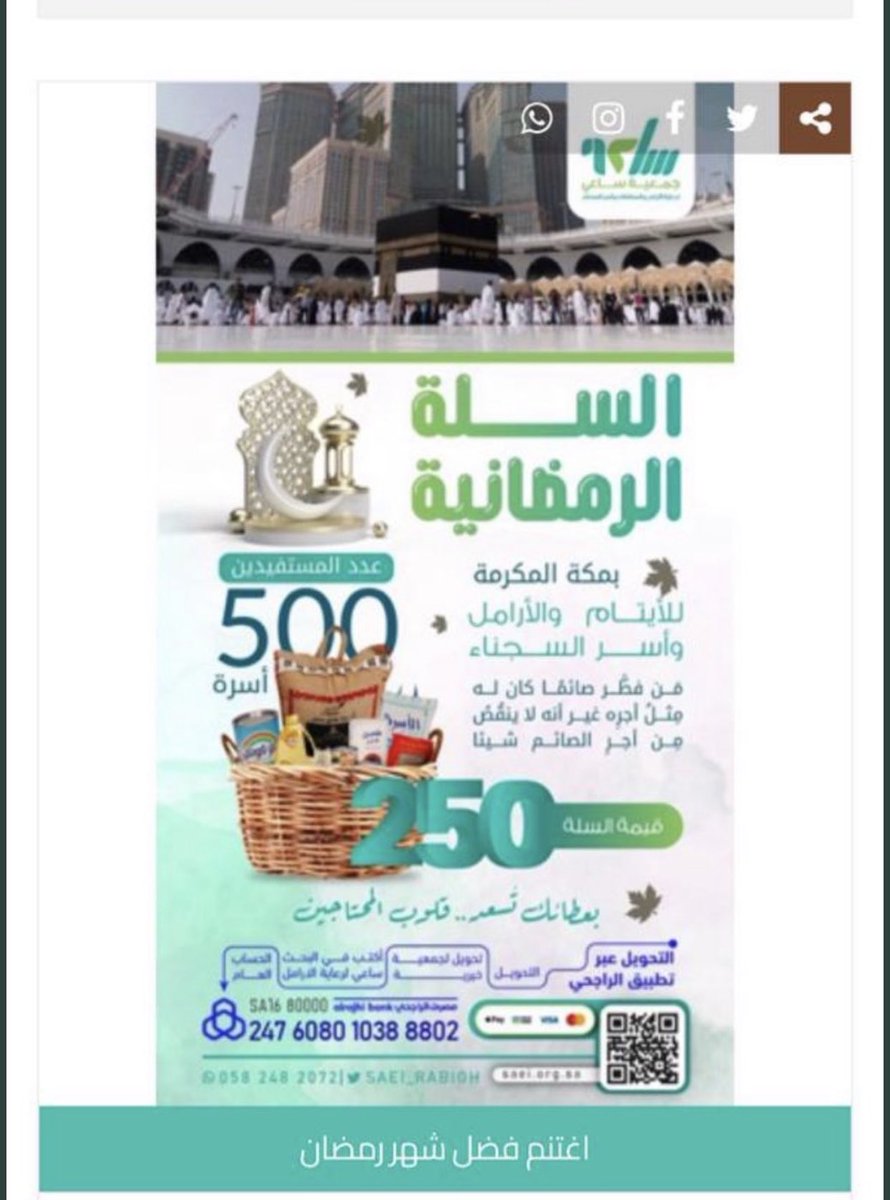 سلة رمضانيه للارامل والايتام والمحتاجين ، ولو بريال واحد تقدر تساهم في اطعامهم ونحنا في شهر تُضاعف فيه الحسنات كل من يتبرع يكون ربنا اختاره واصطفاه عز وجل ف ياحظ من يكون من ضمن المتبرعين والحمدلله وصلنا ل 50% وباقي القليل بإدن الله 🙏