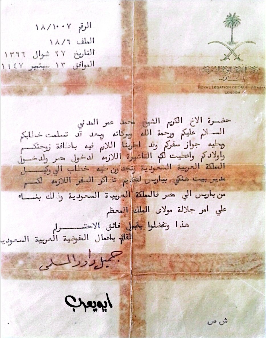وفي ١٩٤٧م خاطب الملك عبدالعزيز آل سعود طالبا العودة إلى بلده الأم حيث أنه كان خارج المملكة العربية السعودية وقت التأسيس وعندها أصدر الملك عبدالعزيز أوامره بإرجاع الدكتور محمد بن عمر المدني وجميع أفراد أسرته إلى المملكة العربية السعودية حيث عاش في مدينة جدة archive.aawsat.com…