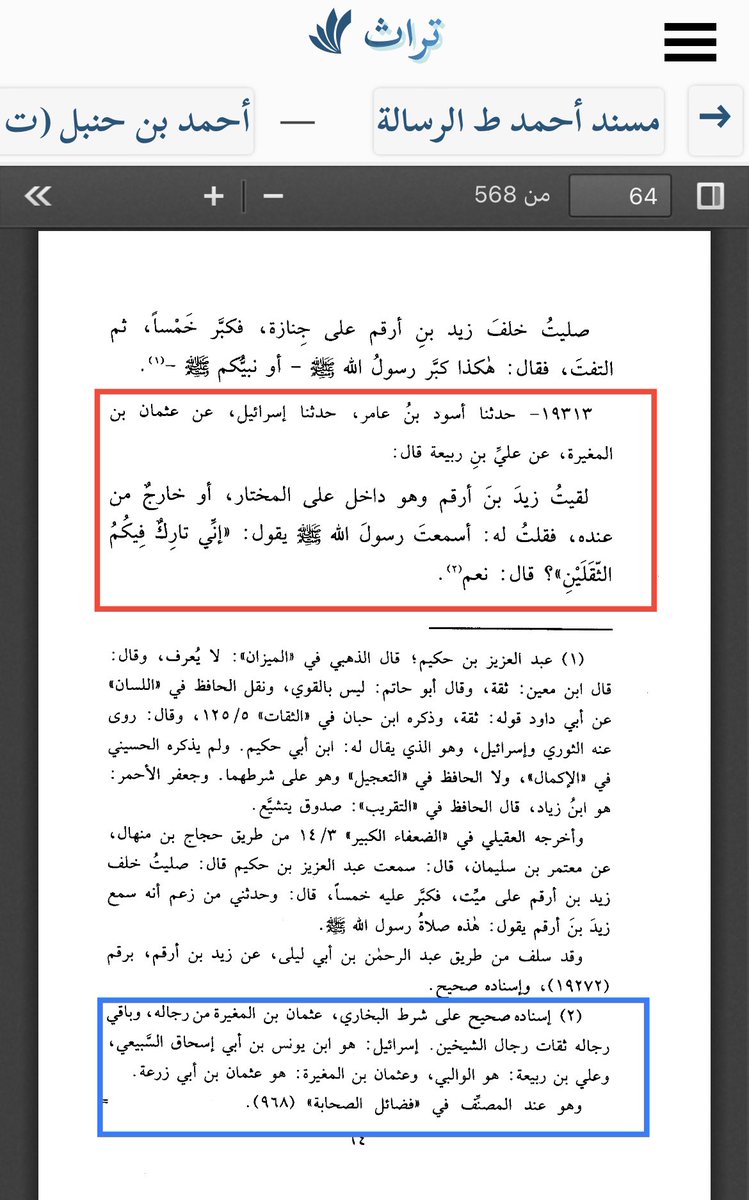 ٣. إسرائيل بن يونس عن عثمان بن المغيرة عن علي بن ربيعة الأسدي عن زيد بن ارقم.
