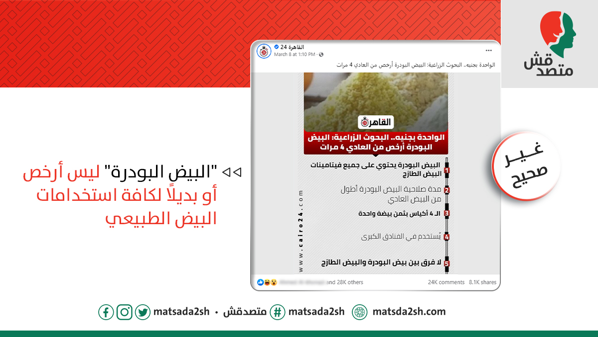 - الكلام ده غير صحيح. البيض البودر موجود في الأسواق منذ سنوات ويستخدم في صناعة المعجنات والحلويات، وليس بديلًا لكافة استخدامات البيض الطبيعي، كما أنه ليس أرخص. ✅✅