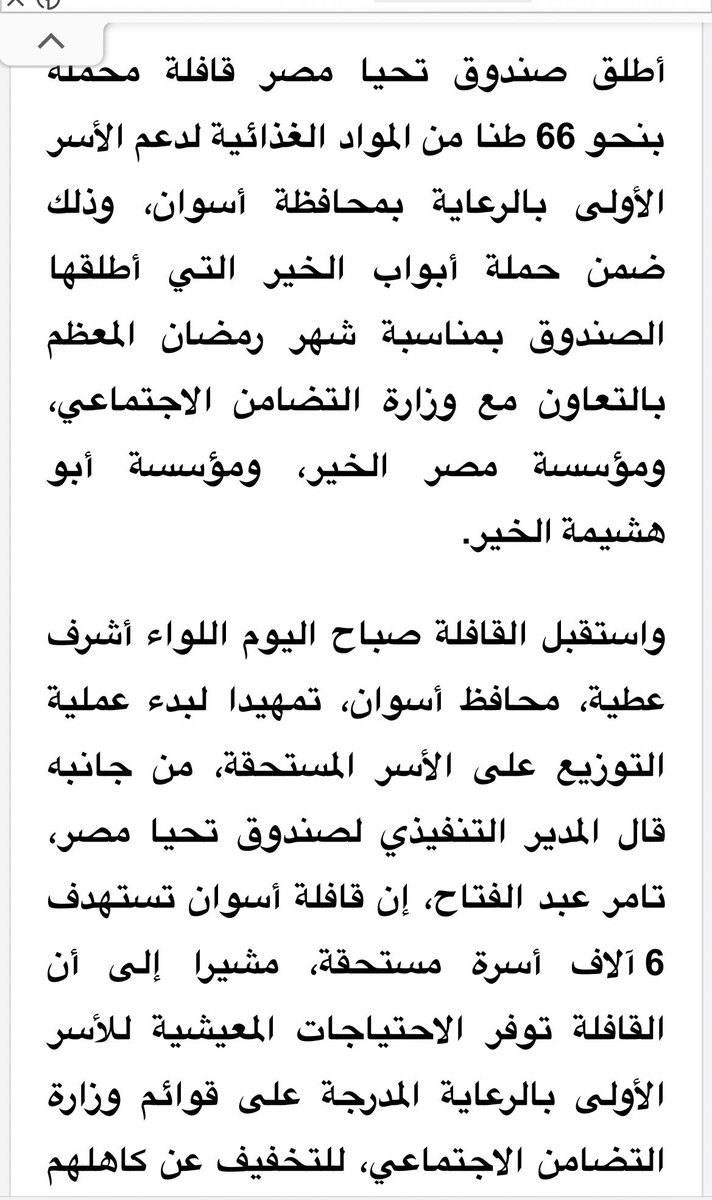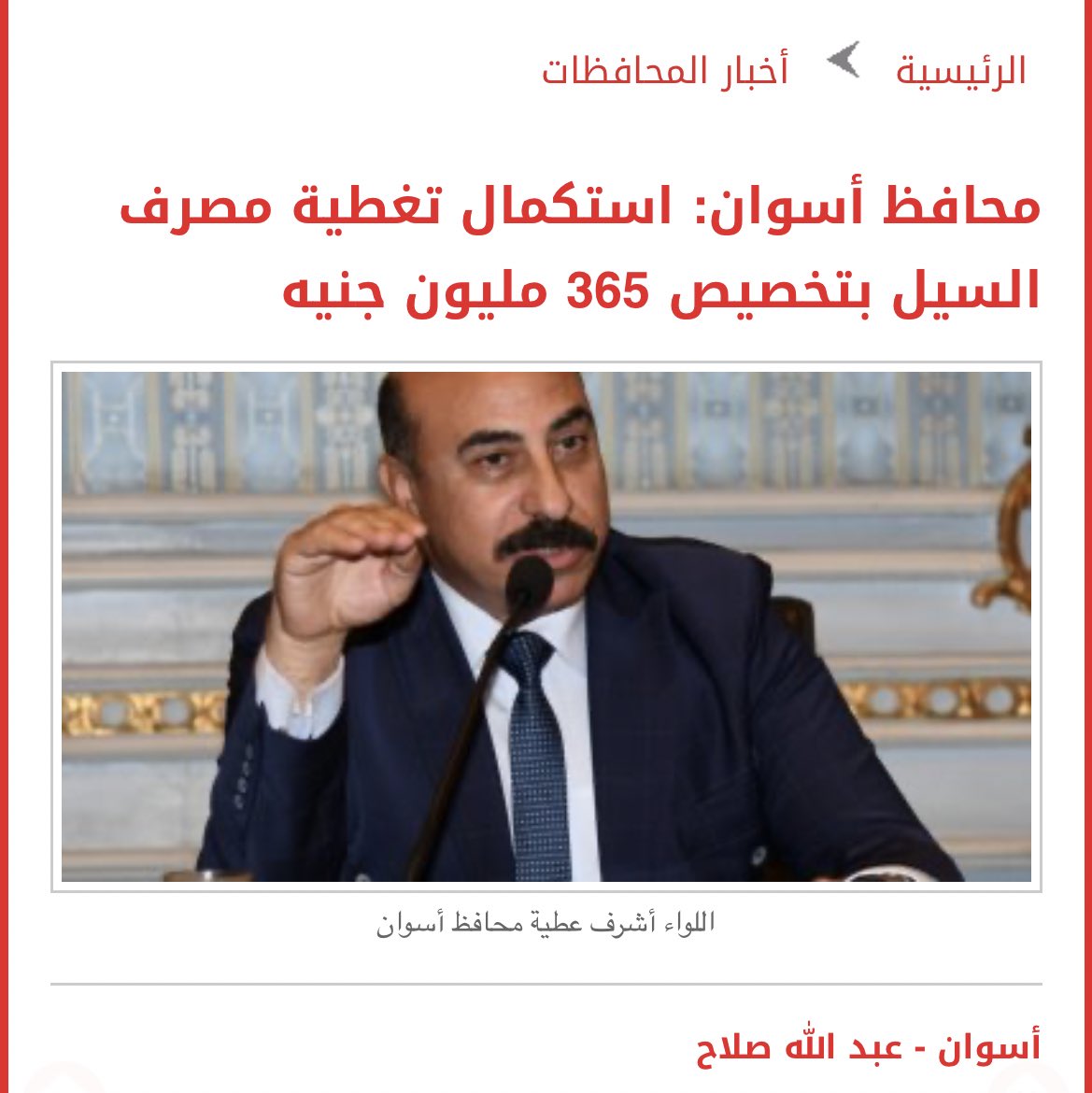 لازم أقدم الشكر للسيد اللواء أشرف عطية محافظ أسوان وفريقه الجاد فردا فردا على عملهم الدؤوب و مجهودهم المميز- لأن من لم يشكر الناس لم يشكر الله ودا مش شكر موجه مني فقط ، الحقيقة دا عن لسان أهالي أسوان .