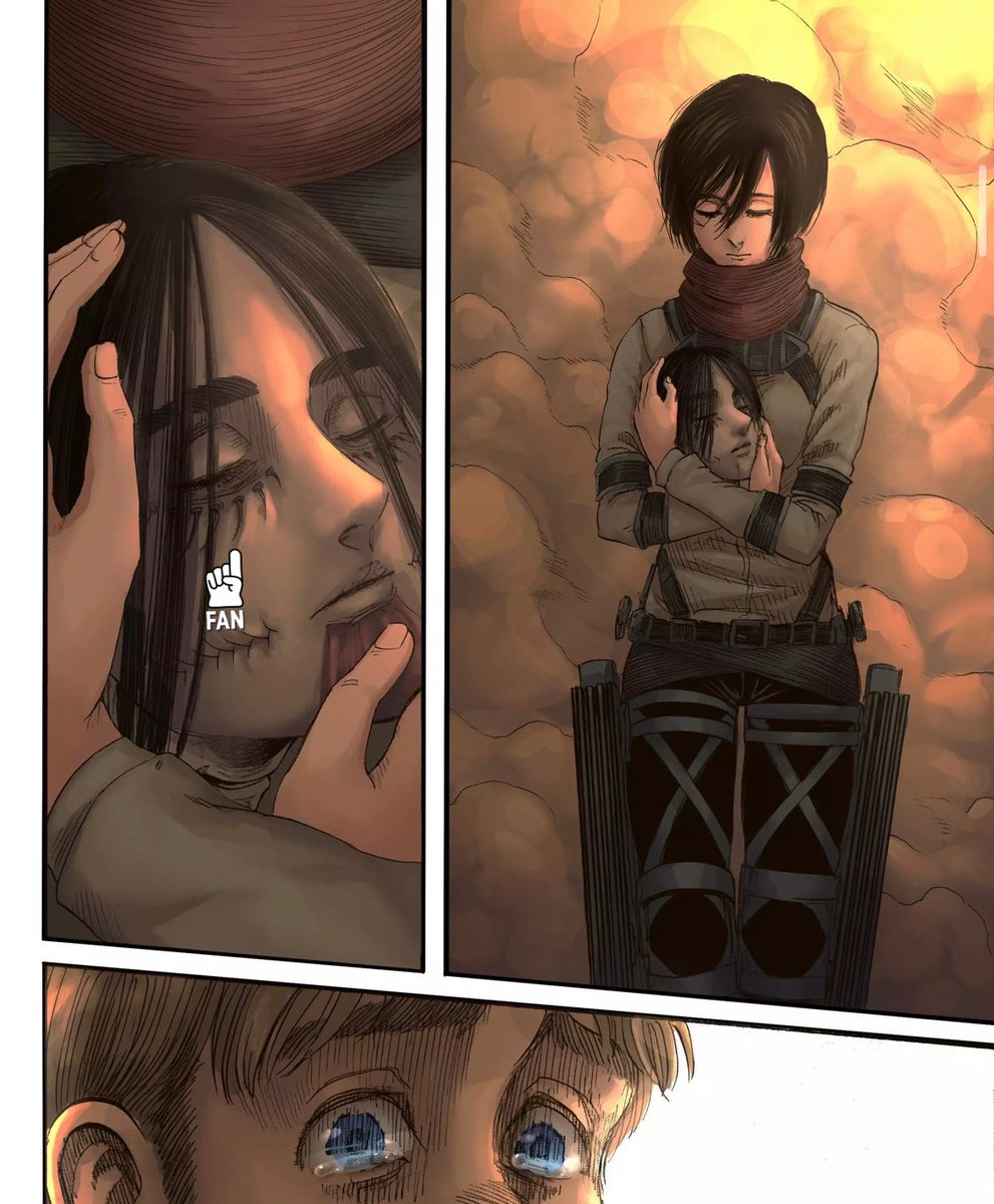 نهاية هذه المانجا المدرسية كانوا محور شخصيات القصة الثلاثة يشاهدون فيلماً في السينما، واختلفوا وبشدّة ميكاسا وارمين بخصوص النهاية = الفانز في الواقع