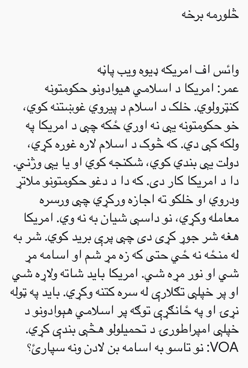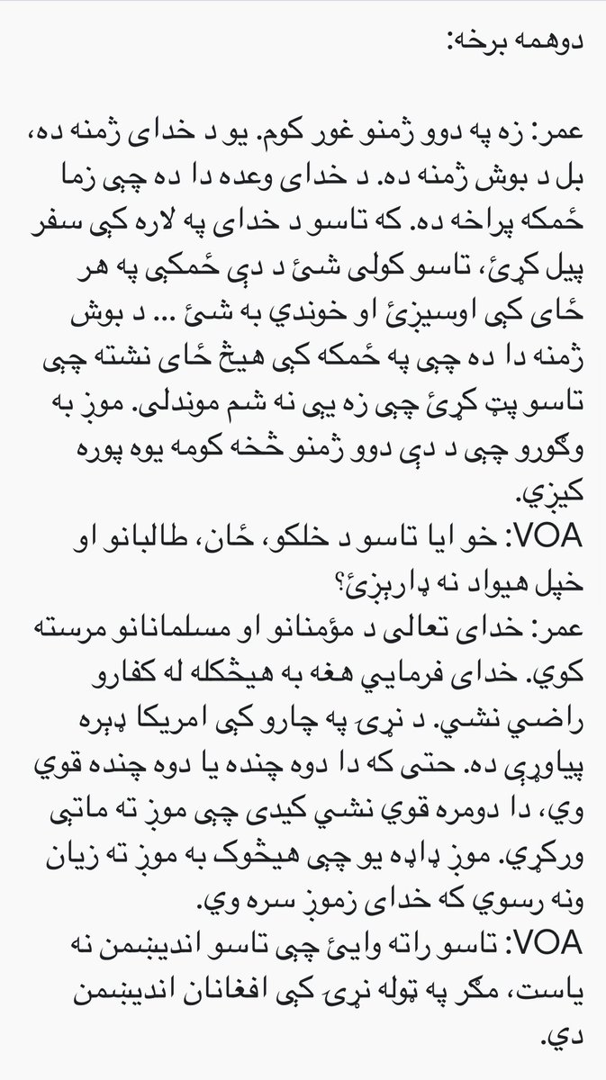 عمر: دا د اسامه بن لادن مسله نه ده. دا د اسلام مسله ده. د اسلام عزت په خطر کې دی. د افغانستان دود هم همداسې دی.