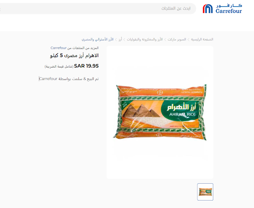 - بوست منتشر بشكل كبير جدًا، بيقول: "الأرز المصري في كارفور السعودية 5 كيلو بـ 13 ريال أي ما يعادل 20 جنيها للكيلو"، مُرفق معه سكرين شوت لمنتج أرز اسمه "الأهرامات" يُباع في متجر كارفور السعودية الإلكتروني،