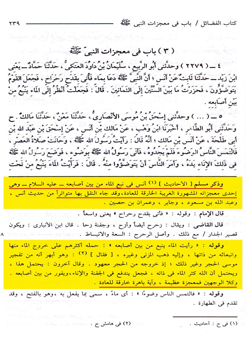 (وذكر مسلم أحاديث أنس في نبع الماء من بين أصابعه عليه السلام وهي إحدى معجزاته المشهورة الغريبة الخارقة للعادة، وقد جاء النقل بها متواتراً من حديث أنس، وعبد الله بن مسعود، وجابر، وعمران بن حصين).