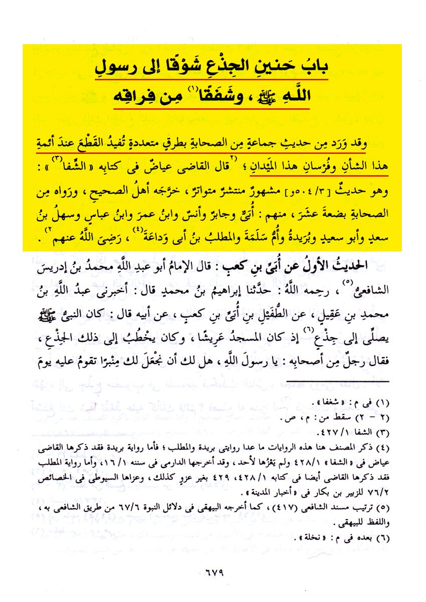 (بابُ حنين الجِذْع شَوْقاً إلى رسول الله صلى الله عليه وسلم، وشَفَقاً من فِراقِه، وقد ورد من حديث جماعةٍ من الصحابة بطرقٍ متعددةٍ تفيد القطع عند أئمة هذا الشأن وفرسان هذا الميدان).