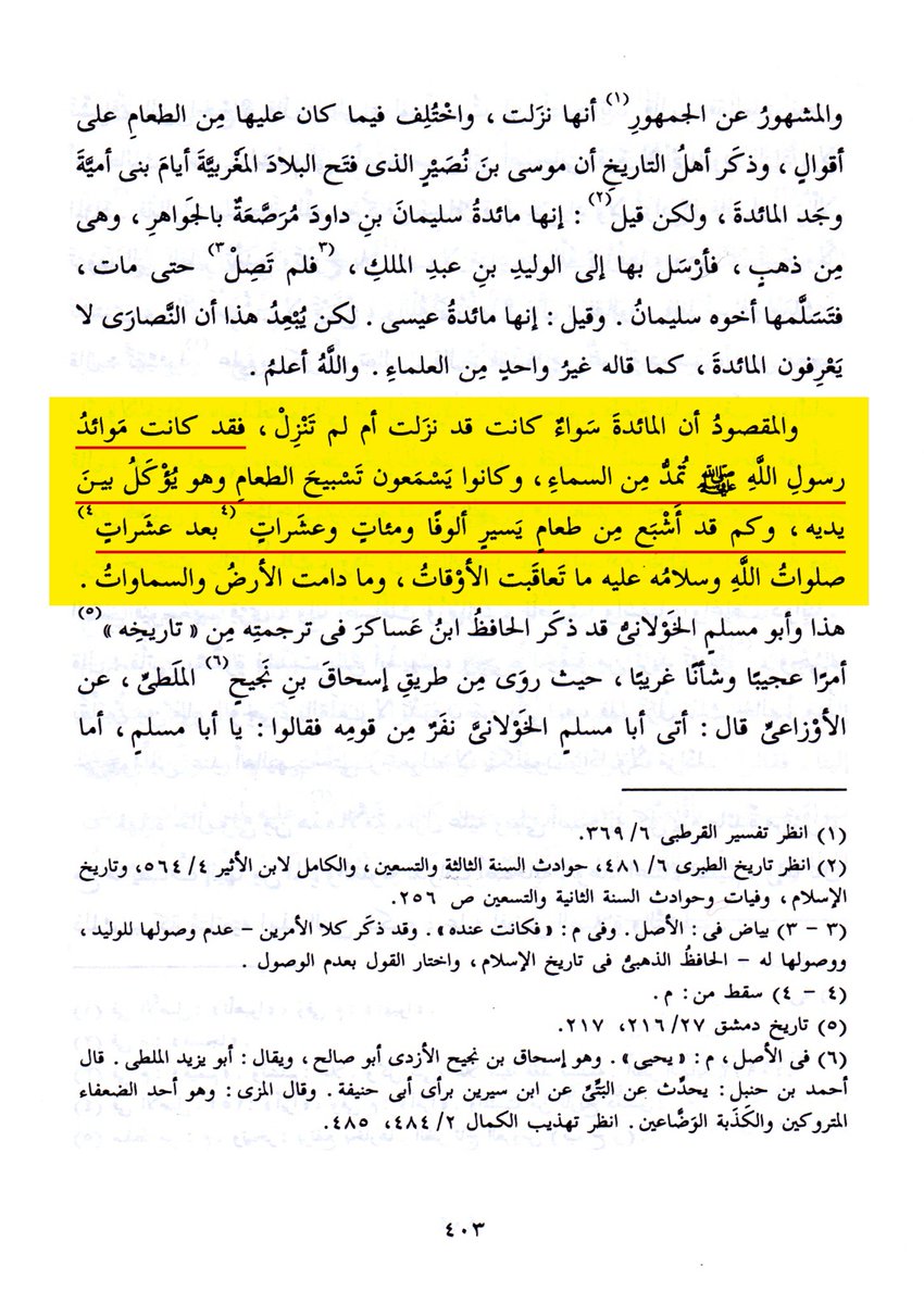 (فقد كانت موائد رسول الله صلى الله عليه وسلم تُمدُّ من السماء، وكانوا يسمعون تسبيح الطعام وهو يُؤكل بين يديه، وكم قد أشبَع من طعام يسيرٍ ألوفاً ومئاتٍ وعشراتٍ بعد عشراتٍ صلوات الله وسلامه عليه ما تعاقبت الأوقات، وما دامت الأرض والسماوات).