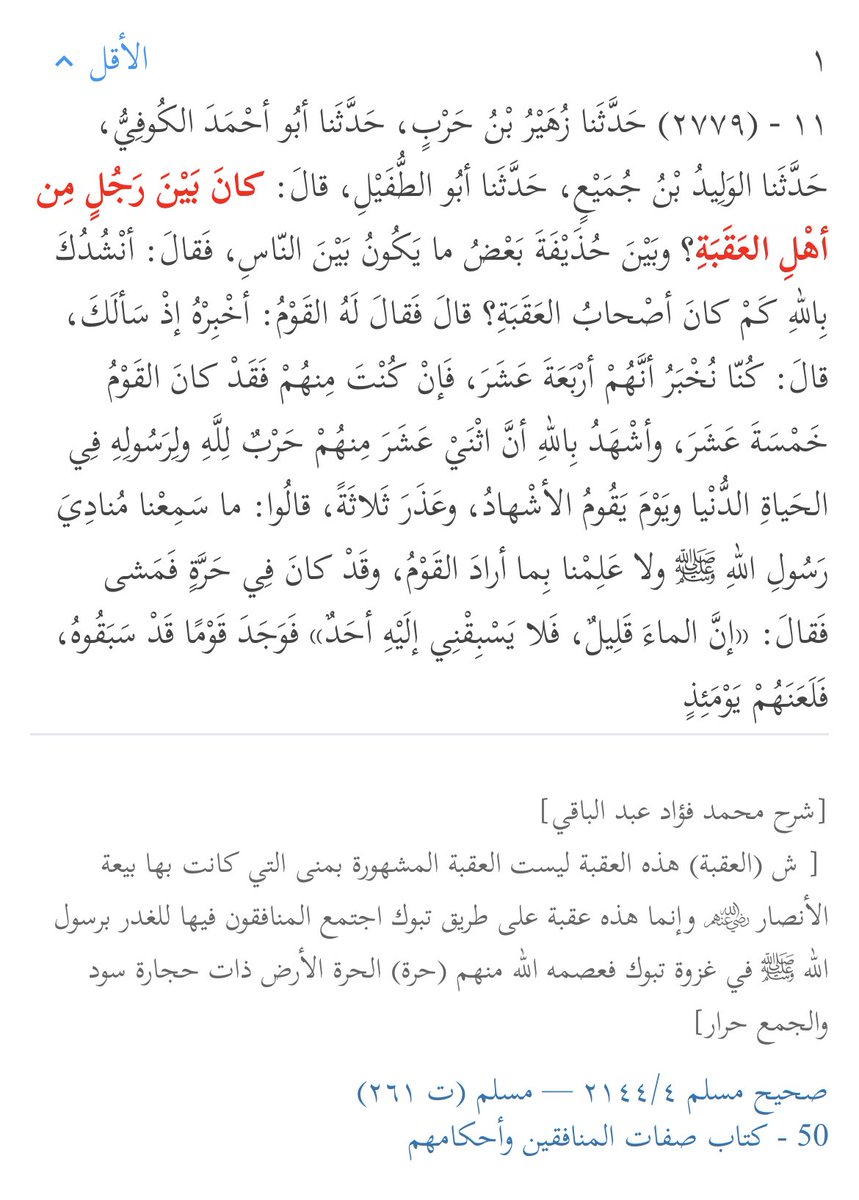 هذا نموذج بسيط في كشف منافق واحد من اهل العقبة، ولعمري لو تم معرفة بقية الاربعة عشر لاجتمعت الأمة على الحق، ولكن سنة الله في الابتلاء والتمحيص تأبى ذلك، فصار موالاة أئمة الضلال والدعاة إلى النار دينا يدان به، مع أن اهل العقبة هم "المنافقون الى يوم القيامة" كما قال النبي ﷺ.