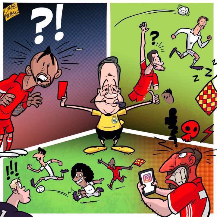 منذُ الدقيقة الاولى الى نهاية المباراة تغاضى الحكم عن انواع التدخلات من كاسيميرو أثارة غضب جماهير و لاعبين البايرن تدخلات عنيفه طيلة المباراة ولم يحصل فيها الا على كرت اصفر 😂 !!