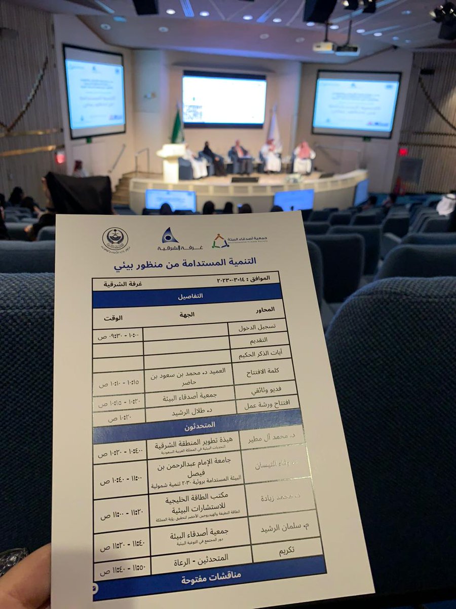 شارك بها نخبة من المتحدثين وبحضور كثيف من القطاعات الحكومية والخاصة وغيرالربحية والمهتمين بالبيئة وذكر مدير المركز الى حجم الضرر الذي ستمر به الارض ان لم توضع حلول مناسبةللاستدامة البيئية والمحافظة على هذه الموارد للأجيال القادمة