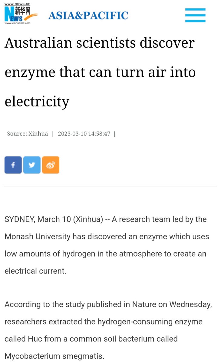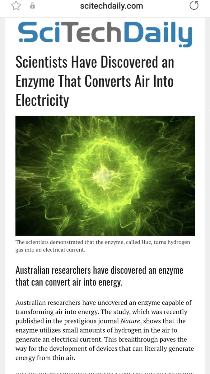 حيث اكتشف العلماء إنزيما يستطيع تحويل الهواء إلى طاقة. و يستهلك هذا الانزيم، #الهيدروجين من بكتيريا التربة لتوليد التيار الكهربائي.