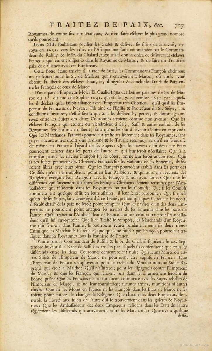 كان يا ماكان.. إمبراطور في #المغرب يأمر بمهاجمة كل سفن فرنسا وأسر من عليها وبيعهم في الاسواق.. ويجبر ملك فرنسا لويس 13 على إمضاء معاهدة سلام.. وفي عرض البحر على سفينة قبالة مدينة آسفي.. ويدفع دية لفداء أسراه.. فقط لأن فرنسيا سرق كتابا من مكتبة الامبراطور