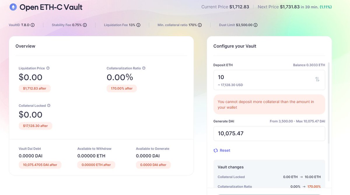 Si utilizamos Ether mediante el vault ETH-C tenemos las siguientes condiciones: