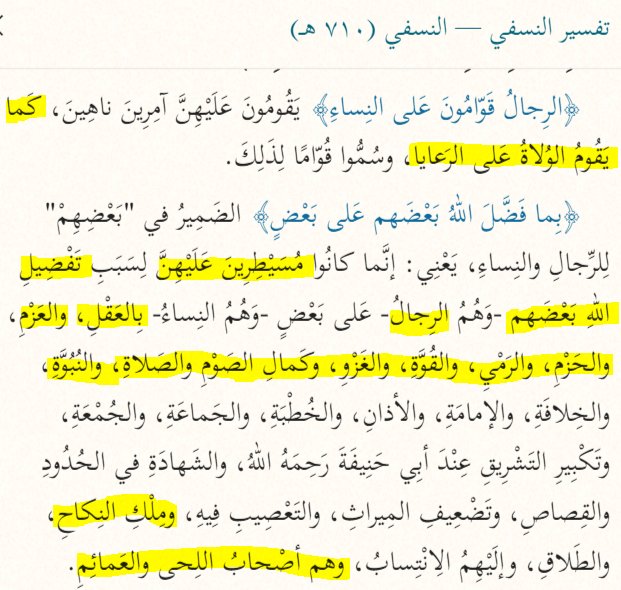 إذ حق الرجل أن يكون متبوعاً لا تابعاً، وقد سمى الله الرجال قوامين على النساء وسمى الزوج سيداً، فقال تعالى: «وألفيا سيدها لدى الباب» إحياء علوم الدين «٢/٤٥»