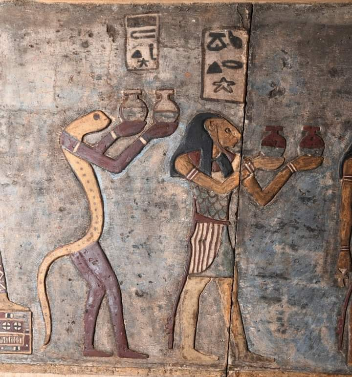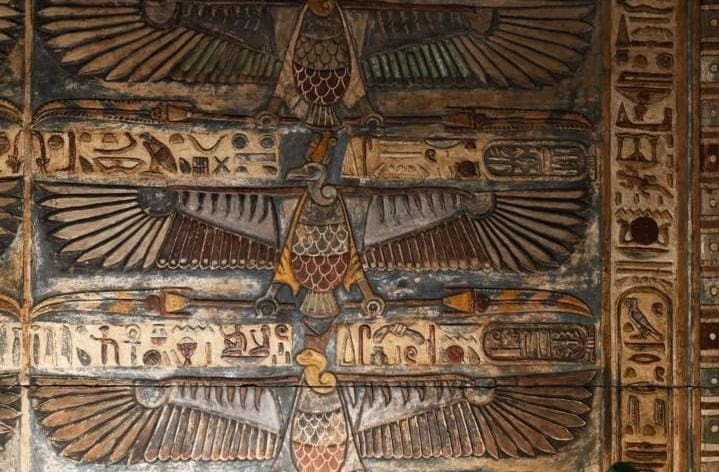 الثمانية عشر القائمة بذاتها بزخارف نباتية مختلفة عن بعضها البعض فكل تاج عمود له زخرفة مختلفة عن الأخرى وهذه من أهم مميزات معبد إسنا.