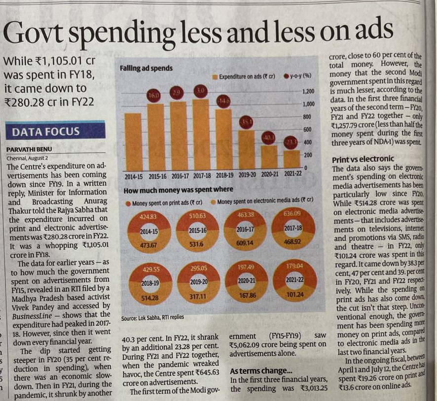 Annual ad spending by Modi Govt in the Centre is down by 70% to Rs 280 crore