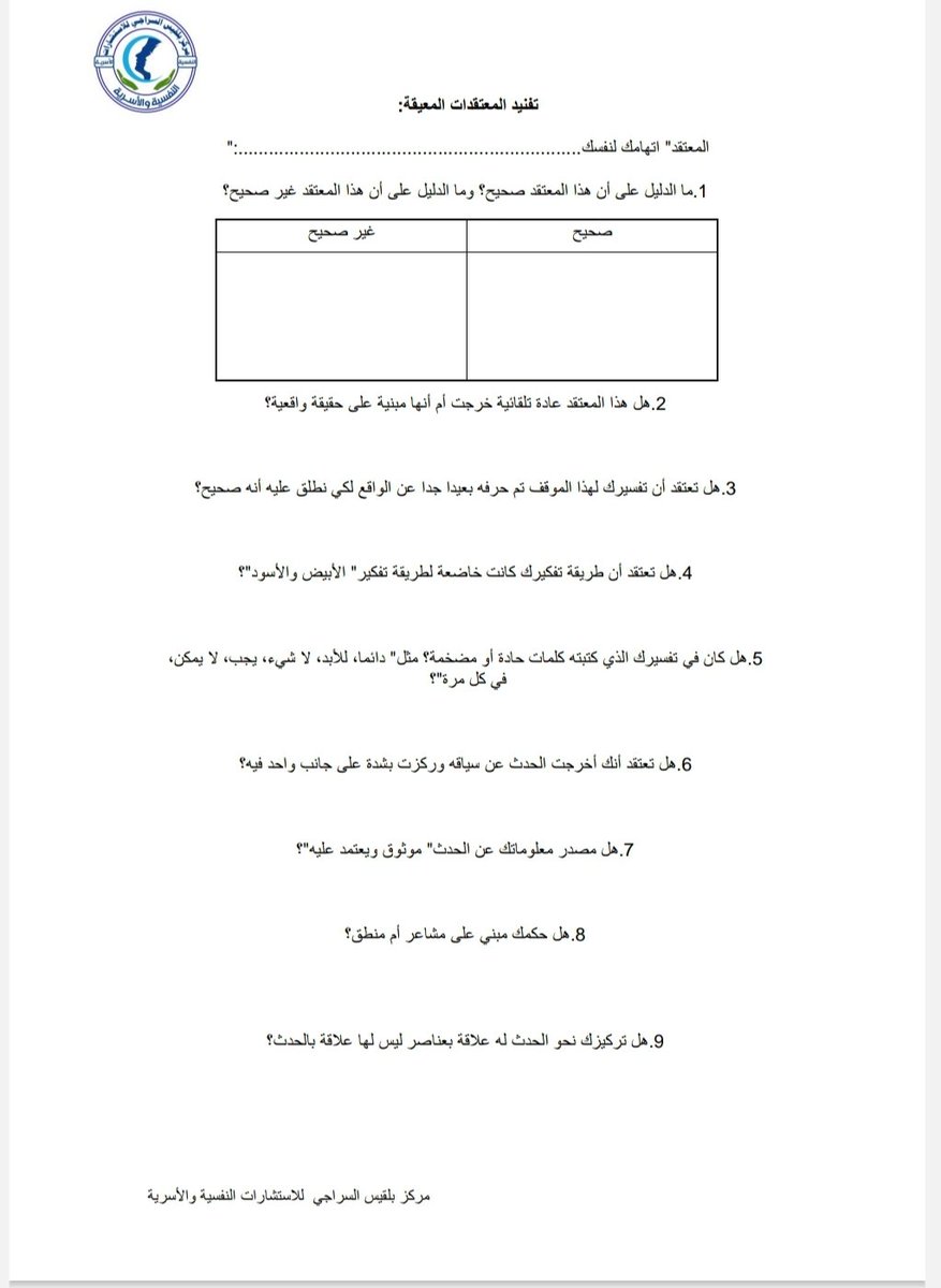 2. تقييم اثر هذه المعتقدات على نظرتك لنفسك، وعملك، وعلاقتك، ومزاجك.