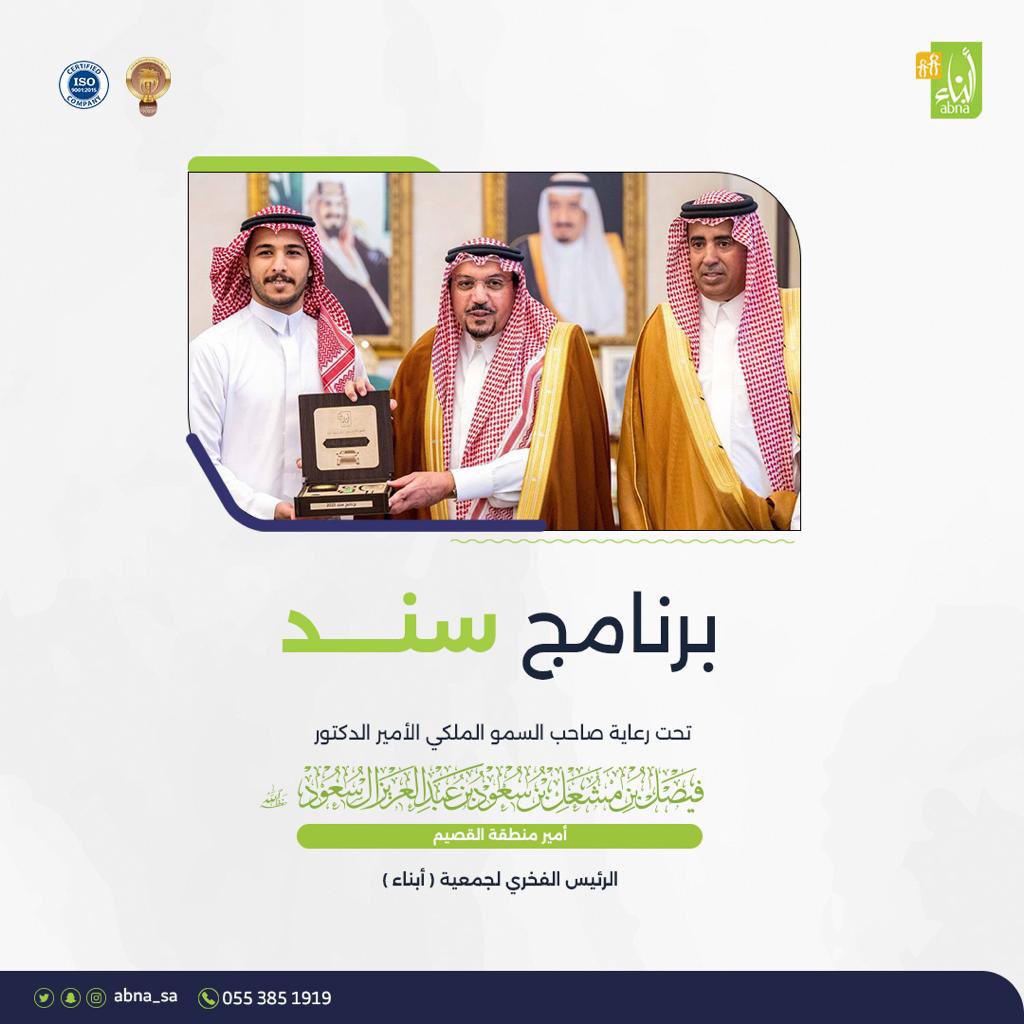 دشن صاحب السمو الملكي الأمير الدكتور فيصل بن مشعل بن سعود بن عبدالعزيز أمير منطقة القصيم الرئيس الفخري للجمعية برنامج #سند أحد المشاريع التنموية للمستفيدين الأيتام الباحثين عن عمل من الخريجين والطلاب الجامعيين .