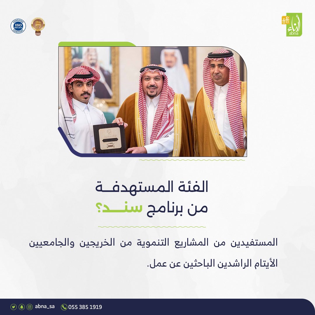 برنامج #سند هو مشروع تنموي مبتكر يقدم فرصة جديدة للأيتام الراشدين ليرسموا مستقبلهم ويعملوا على تحقيق الاكتفاء الذاتي لهم ويكونوا سندا لأسرهم من خلال هذا المشروع .