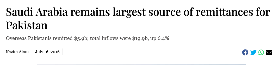السعودية المركز الأول في أكبر مصدر تحويلات إلى باكستان والتي تساهم بدعم اقتصاد باكستان وملايين الأسر الباكستانية .