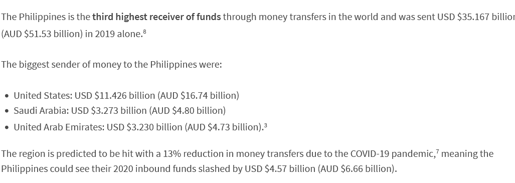 السعودية ذات الصحراء الذهبية تتصدر المركز الثاني في أكبر مصدر للتحويلات إلى الفلبين و طبعًا أموال السعودية ساهمت برفع المستوى المعيشي لأكثر من ١١٣ مليون فلبيني .