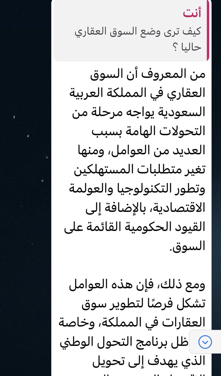 خمسة اسئلة وجهتها لروبوت يستخدم تقنية الذكاء الاصطناعي Ai .. عن السوق العقاري السعودي شاهدو اجابات الروبوت المثيرة :