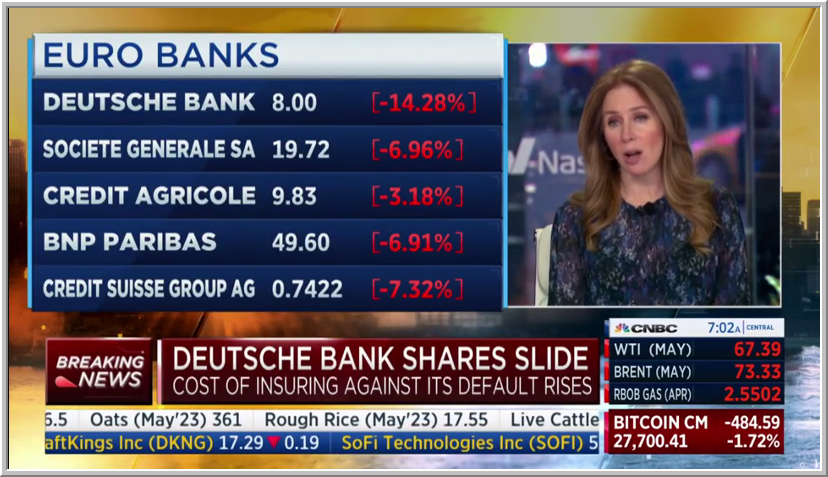 البنوك الأوروبية تتأثر بشكل لاباس به بتراجع دوتشيه بانك، لكن الصورة قد تتحول الى اكثر سوءاً اذا تفاعلت البنوك الامريكية وهبطت بشكل اكبر، يبدو ان الالمان سيحذون حذو السويسريين ولن يناموا خلال اجازة الويك اند، وسيعملون على محاولة انقاذ الأوضاع