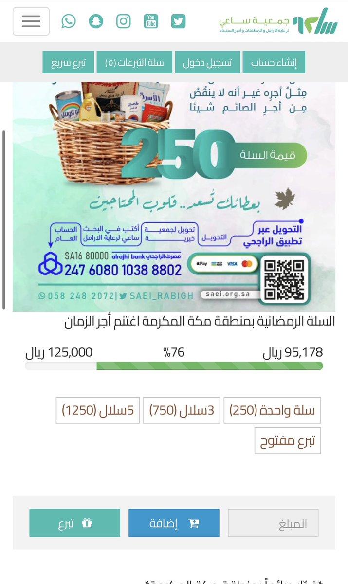 في البدايه استاذنكم هذي سله رمضانيه للافطار الايتام والأرامل وأسر السجناء وتذكر ان كل ريال تدفعه رصيد لك بيجي يوم راح تحتاجه والله يكتب اجركم جميعاً🌹