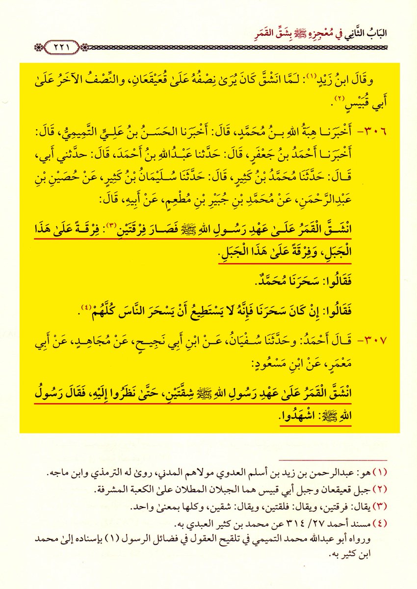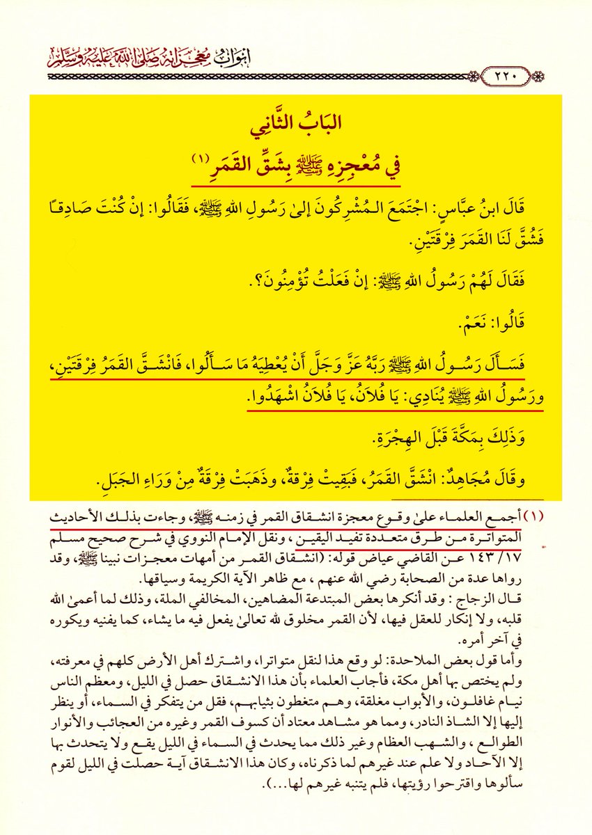 وقال محقق الكتاب: (أجمع العلماء على وقوع معجزة انشقاق القمر في زمنه صلى الله عليه وسلم، وجاءت بذلك الأحاديث المتواترة من طرق متعددة تفيد اليقين). 👇🏻