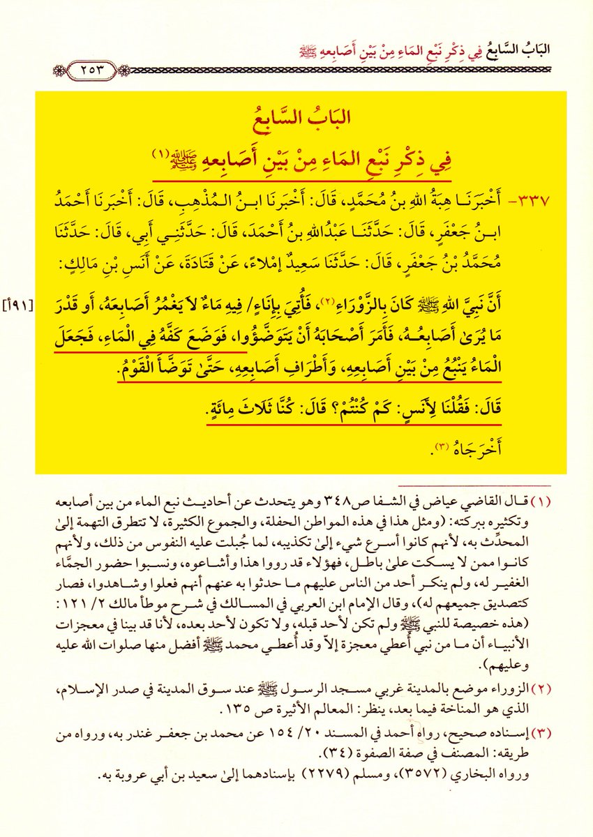قال ابن الجوزي: (الباب السابع: في ذكر نبع الماء من بين أصابعه صلى الله عليه وسلم).