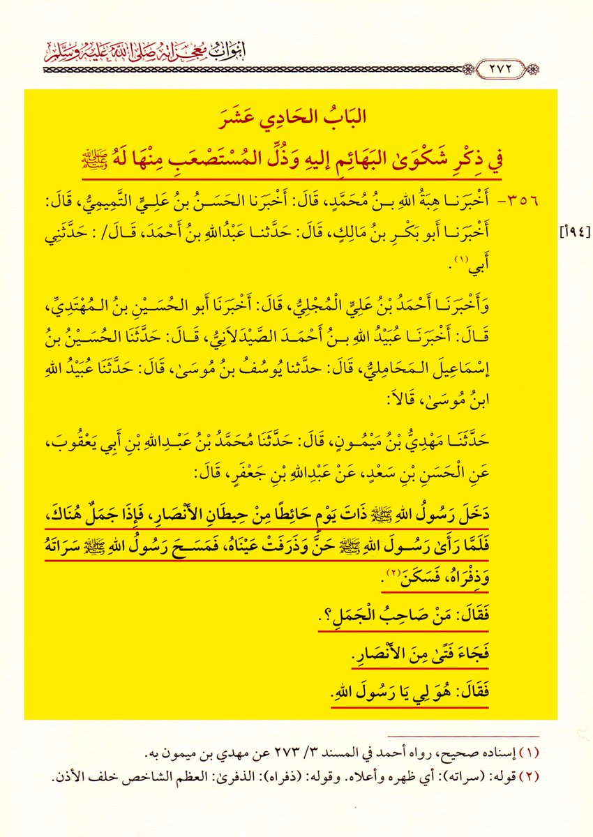 قال ابن الجوزي: (الباب الحادي عشر: في ذكر شكوى البهائم إليه وذل المستصعب منها له صلى الله عليه وسلم).